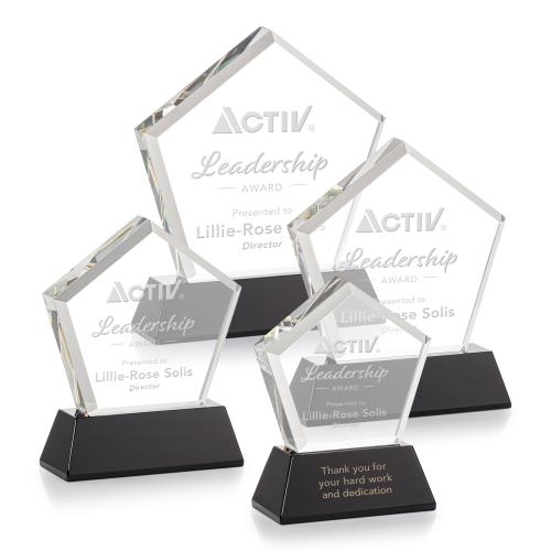 Of the Crystal Awards, this beautiful Genosee Award on Base - Black is a great choice. (OPT6112-K) The Genosee Award on Base features a sparkling faceted extra-thick Optical Crystal pentagon mounted on your choice of 8 distinct tall tapered bases. Second Position Etch & Colorfill Optional. A brilliant award to recognize an exceptional performance.