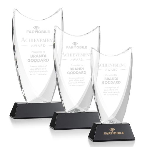 Of the Crystal Awards, this beautiful Dawkins Award - Black is a great choice. (OPT6732-K) The Dawkins features deep, curved bevels on the back of a clear optical crystal upright, tapering toward the ends of the concave top. The highly polished curves and flaring bevels emphasize the flawless clarity and sparkle of optical crystal. Mounted on an Ebony Crystal tapered base. Second position etch optional.