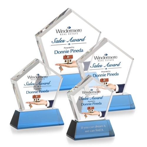 Of the Crystal Awards, this beautiful Genosee VividPrint™ Award on Base - Sky Blue is a great choice. (OPV6112-S) The Genosee Award on Base features a sparkling faceted extra-thick Optical Crystal pentagon mounted on your choice of 8 distinct clear or colored tapered base. Second Position Etch & Colorfill Optional. A brilliant award to recognize an exceptional performance.