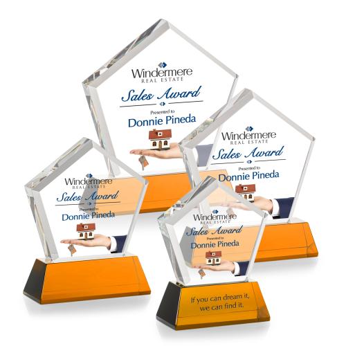 Of the Crystal Awards, this beautiful Genosee VividPrint™ Award on Base - Amber is a great choice. (OPV6112-A) The Genosee Award on Base features a sparkling faceted extra-thick Optical Crystal pentagon mounted on your choice of 8 distinct clear or colored tapered base. Second Position Etch & Colorfill Optional. A brilliant award to recognize an exceptional performance.