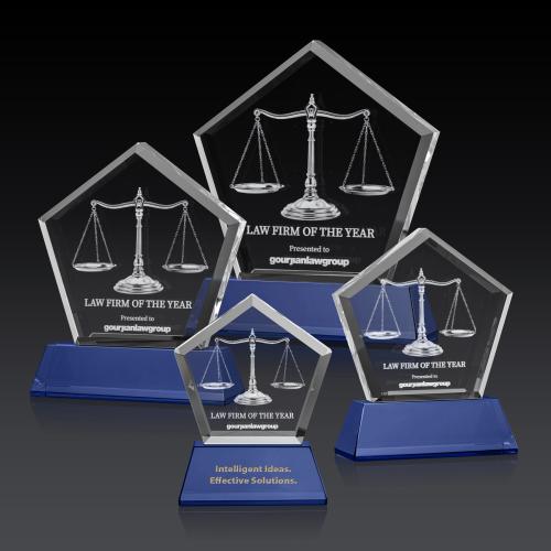 Of the Crystal Awards, this beautiful Genosee on Base (3D) - Blue is a great choice. (OPD6112-L) The Genosee Dimensions 3D award features a thick optical crystal pentagon with a beveled frame and large window to embed your message of recognition excellence right into the crystal. A striking award to commemorate an exceptional achievement or special anniversary. Mounted on your choice of tall tapered optical crystal base in 8 distinct colors. Second Position Etch Optional.