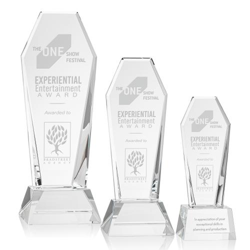 Of the Crystal Awards, this beautiful Romford Award on Base - Clear is a great choice. (OPT1831-C) The spectacular Romford is a tall statuesque Optical Crystal award with double sided beveled edges. Mounted on an Optical Crystal base. Second position etch and colorfill optional.