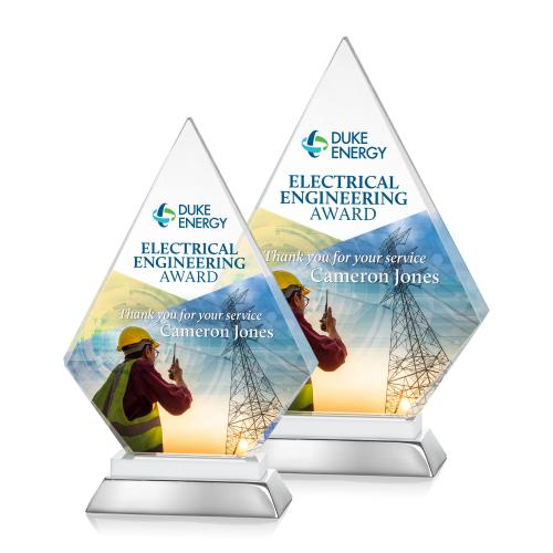 Of the Crystal Awards, this beautiful Valhalla VividPrint™ Award - White is a great choice. (AWV8832-W) The Hansen Starfire VividPrint Crystal award features an arched peak mounted on a solid ivory crystal and polished aluminum double base. A stunning recognition piece to honor a special achievement.
