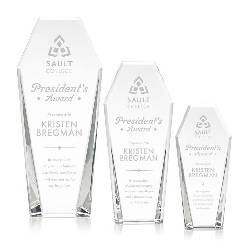 Of the Crystal Awards, this beautiful Romford Award is a great choice. (OPT1831) The spectacular Romford is a tall freestanding Optical Crystal award with double sided beveled edges and notched top. Recognize excellence with a crystal monument that properly represents your hard earned achievement. Hand Deep Etched and packaged in a satin-lined presentation gift box.