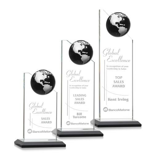 Of the Crystal Awards, this beautiful Arden Globe Award - Black/Silver is a great choice. (OPG251-KS) The Arden Globe Award features a tall Starfire Crystal tower with a slanted top and a half Optic Crystal Ebony Globe mounted at the top. Mounted on a matching blue base. A great recognition piece to celebrate a far reaching achievement.