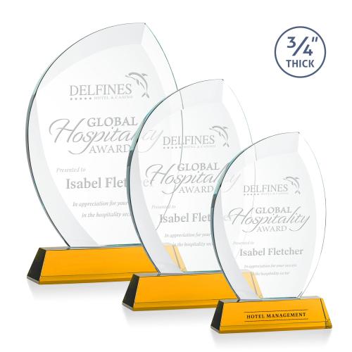 Of the Crystal Awards, this beautiful Wichita Award on Newhaven Base - Amber is a great choice. (AWS24151-A) The Wichita Award features thick 3/4" Starfire Crystal with deep sweeping bevels that elegantly arch around your words of recognition with shimmering light. Mounted on a tall tapered Optic Crystal base in your choice of 9 distinct colors. A modern monument for any special achievement. Second Position Etch & Colorfill Optional.