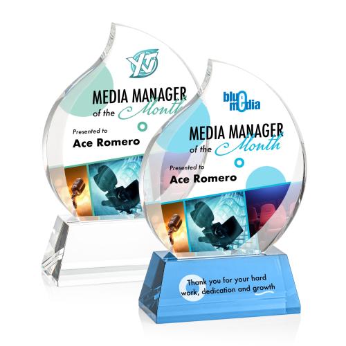 Of the Crystal Awards, this beautiful Preswick Flame VividPrint™ Award on Base is a great choice. (OPV9725-C) The beautiful curves of the Preswick VividPrint Optical Crystal Flame Award are further enhanced by interchanging bevels to create a sparkling recognition piece to honor your exceptionalism. Mounted on a tall tapered Optical base in your choice of 8 distinct colors. Let your message POP with full color VividPrint! Second Position Imprint Optional.