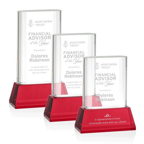 Of the Crystal Awards, this beautiful Merit Award on Base - Red is a great choice. (OPT2104-R) The Optical Crystal Merit Award is a spectacular recognition piece worthy of its name. Featuring faceted stepped and curved sides to create a glimmering frame for your exceptional achievement. Mounted on a tall tapered Optical Crimson Red base. Second position etch & colorfill optional.