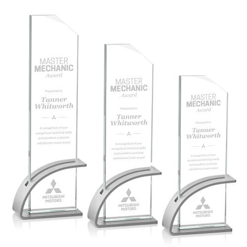 Of the Crystal Awards, this beautiful Barton Award - Silver is a great choice. (AWS8771-S) The spectacular Barton Award features a tall Starfire Crystal pane with a clipped and beveled top and held upright with a slotted brushed aluminum silver base. A great choice for employee recognition or sales achievement awards.