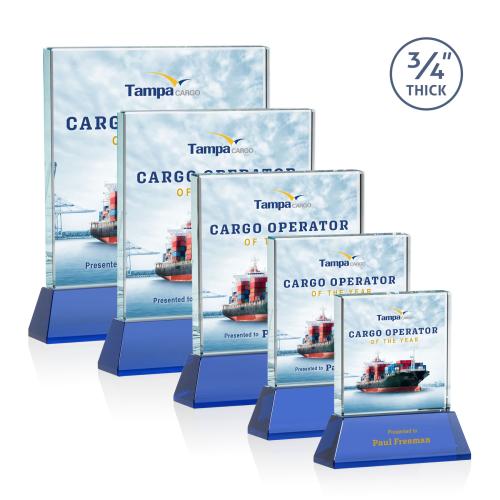 Of the Crystal Awards, this beautiful Terra VividPrint™ Award on Newhaven - Blue is a great choice. (AWV17381-L) A solid pane of thick 0.75" Starfire Crystal is mounted on a tall tapered Starfire base in your choice of 8 distinct colors. A great choice for corporate recognition and to honor an exceptional achievement. 2nd position VividPrint optional.