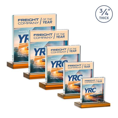 Of the Crystal Awards, this beautiful Terra VividPrint™ Award - Amber is a great choice. (AWV1731-A) A solid pane of thick 0.75" Starfire Crystal is mounted on a flat edged base in your choice of 8 distinct colors. A great choice for corporate recognition and to honor an exceptional achievement.