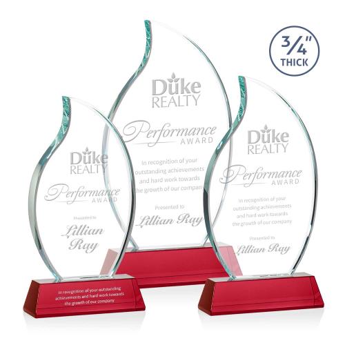 Of the Crystal Awards, this beautiful Croydon Flame Award on Newhaven Base - Red is a great choice. (AWS17451-R) The Croydon award features an elegant 3/4" thick Starfire Crystal flame to commemorate your achievement with an eternal symbol of greatness. Mounted on your choice of 8 sparkling colored Newhaven bases. Second position etch optional.