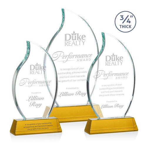 Of the Crystal Awards, this beautiful Croydon Flame Award on Newhaven Base - Amber is a great choice. (AWS17451-A) The Croydon award features an elegant 3/4" thick Starfire Crystal flame to commemorate your achievement with an eternal symbol of greatness. Mounted on your choice of 8 sparkling colored Newhaven bases. Second position etch optional.