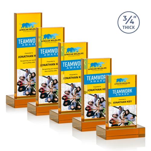 Of the Crystal Awards, this beautiful Hathaway VividPrint™ Award - Amber is a great choice. (OPV2441-A) The Marvelous Hathaway Award features a striking Amber Crystal Tower mounted on a matching thick crystal base. A sensational award for a star recipient. With full-color VividPrint, the only limitation is your imagination.