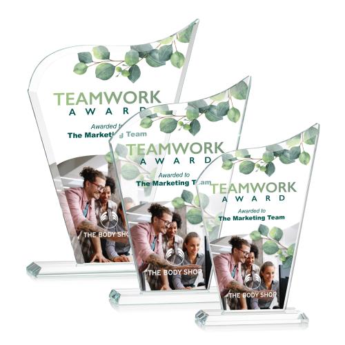 Of the Crystal Awards, this beautiful Hepscott VividPrint™ Award is a great choice. (AWV2331) The top of the Hepscott curves down into its right side, boasting a truly unique Starfire Crystal award, reminiscent of a classical harp. Let your message POP with full color VividPrint!