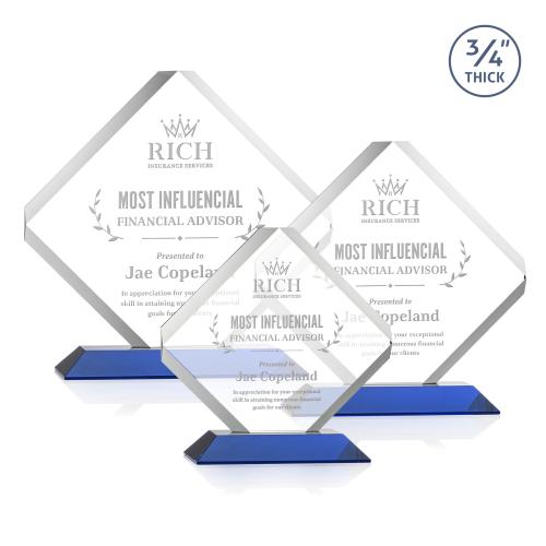 Of the Crystal Awards, this beautiful Toulon Award - Blue is a great choice. (AWS1562-L) The majestic Toulon award is a brilliant diamond-shaped award with a dramatic beveled frame and clipped edges. Ideal for recognizing an exceptional performer or commemorating a momentous milestone or event. Available on your choice of clear or colored mitered base.