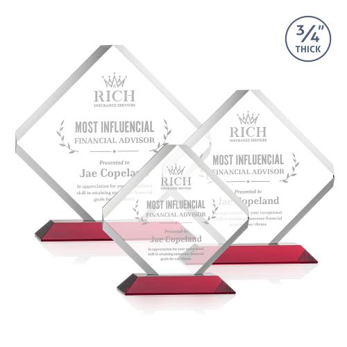 Of the Crystal Awards, this beautiful Toulon Award - Red is a great choice. (AWS1562-R) The majestic Toulon award is a brilliant diamond-shaped award with a dramatic beveled frame and clipped edges. Ideal for recognizing an exceptional performer or commemorating a momentous milestone or event. Available on your choice of clear or colored mitered base.