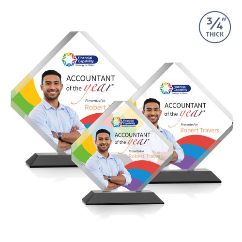 Of the Crystal Awards, this beautiful Toulon VividPrint™ Award - Black is a great choice. (AWV1562-K) The majestic Toulon VividPrint award is a brilliant diamond-shaped award with a dramatic beveled frame and clipped edges. Ideal for recognizing an exceptional performer or commemorating a momentous milestone or event. Available on your choice of clear or colored mitered base.
