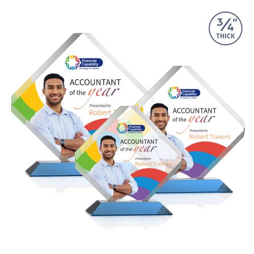 Of the Crystal Awards, this beautiful Toulon VividPrint™ Award - Sky Blue is a great choice. (AWV1562-S) The majestic Toulon VividPrint award is a brilliant diamond-shaped award with a dramatic beveled frame and clipped edges. Ideal for recognizing an exceptional performer or commemorating a momentous milestone or event. Available on your choice of clear or colored mitered base.