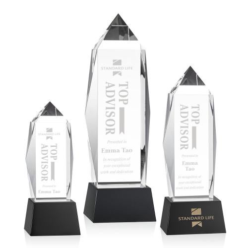 Of the Crystal Awards, this beautiful Bloomington Award on Base - Black is a great choice. (OPT1201-K) The Bloomington VividPrint Award is a brilliant thick Optical Crystal with sparkling beveled sides mounted on an ebony crystal tapered base. An extraordinary recognition piece to appreciate monumental success. Packaged in a black satin-lined presentation gift box. Second position etch & colorfill optional.