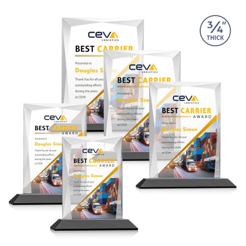 Of the Crystal Awards, this beautiful Messina VividPrint™ Award - Black is a great choice. (AWV1701-K) A staple of the recognition industry, the Messina is a striking award in thick 3/4" Starfire Crystal mounted on clear or colored base. Featuring brilliant interchanging bevels that create a beautiful frame of refracting light for your special achievement. Let your message POP with full color VividPrint!