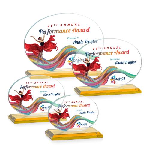 Of the Crystal Awards, this beautiful Austin (Horiz) VividPrint™ Award - Amber is a great choice. (AWV3291-HA) The Austin VividPrint Award features a 1/2" thick Starfire oval mounted on a glistening amber beveled base in your choice of 8 distinct colors. Featuring an ample etch area to include all of your personalizations and words of recognition. Available in horizontal or vertical.