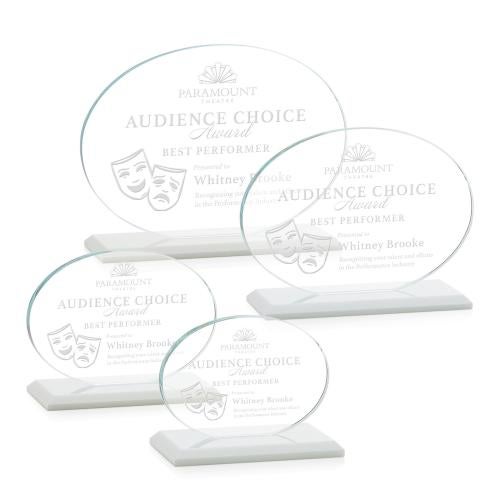 Of the Crystal Awards, this beautiful Austin Award (Horiz) - White is a great choice. (AWS3291-HW) The Austin Award features a 1/2" thick Starfire oval mounted on a glistening beveled base in your choice of 8 distinct colors. Featuring an ample etch area to include all of your personalizations and words of recognition. Available in horizontal or vertical.
