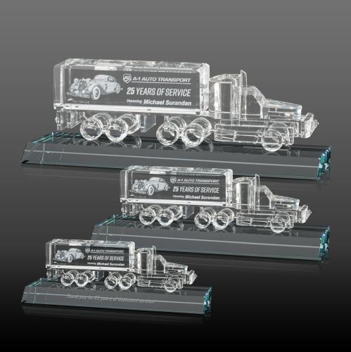 Of the Crystal Awards, this beautiful Crystal 18 Wheeler on Base 3D - Clear is a great choice. (OPD9611-C) Honor the best in transport with the Optical Crystal 18 Wheeler 3D Award! Manufactured from hundreds of hand polished faceted pieces all intricately assembled and features beautiful 3 Dimensional etching inside the crystal. Mounted on a 3/4" mitered Starfire Base, this award makes for a very unique piece perfect for honoring milestones for company drivers, transportation companies, years of service and any recognition within the logistics and transportation industries. Second position deep etch optional.