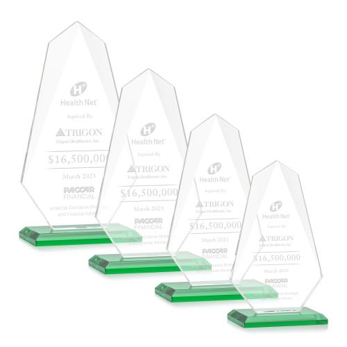 Of the Crystal Awards, this beautiful Jemma Award - Green is a great choice. (AWS8411-G) The Starfire Crystal Jemma Award embodies true elegance with its beveled edge that starts from the top and tapers off towards the bottom. This Stunning Budget Busting Award is mounted on a beveled base and is perfect for employee appreciation in any business sector! Other styles are available. Packaged in a black satin-lined gift box. Available in your choice of 8 distinct colored bases.