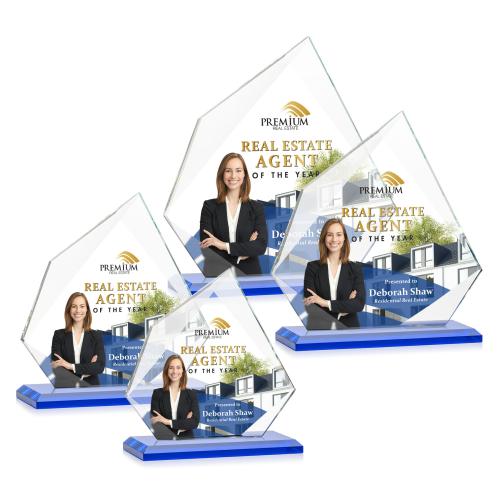 Of the Crystal Awards, this beautiful Lexus VividPrint™ Award - Blue is a great choice. (AWV8421-L) The Starfire Crystal Lexus VividPrint Award embodies true elegance with its unique geometric design and subtle bevels that form a diamond-shaped window into your words of achievement. This Stunning Budget Busting Award is mounted on a beveled base and is perfect for employee appreciation in any business sector! Packaged in a black satin-lined gift box. Available in your choice of 8 distinct colored bases.