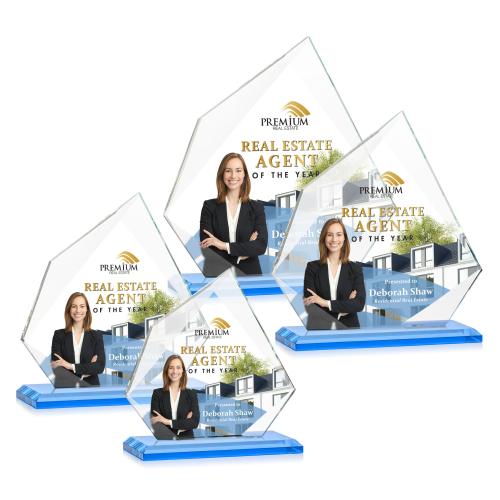 Of the Crystal Awards, this beautiful Lexus VividPrint™ Award - Sky Blue is a great choice. (AWV8421-S) The Starfire Crystal Lexus VividPrint Award embodies true elegance with its unique geometric design and subtle bevels that form a diamond-shaped window into your words of achievement. This Stunning Budget Busting Award is mounted on a beveled base and is perfect for employee appreciation in any business sector! Packaged in a black satin-lined gift box. Available in your choice of 8 distinct colored bases.