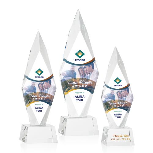Of the Crystal Awards, this beautiful Manilow VividPrint™ Award on Robson Base - Clear is a great choice. (OPV9791-RC) The Manilow Optical Crystal VividPrint award on a Robson base in your choice of clear, blue, green, or black. Featuring a striking arrowhead design with deep bevels that create a diamond-shaped display for your words of achievement recognition. A brilliant award to recognize an exceptional accomplishment.