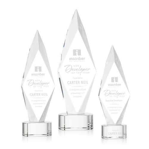 Of the Crystal Awards, this beautiful Manilow Award on Paragon Base - Clear is a great choice. (OPT9791-PC) The Manilow Optical Crystal award on a Paragon base in your choice of clear, blue, green, or black. Featuring a striking arrowhead design with deep bevels that create a diamond-shaped display for your words of achievement recognition. A brilliant award to recognize an exceptional accomplishment.