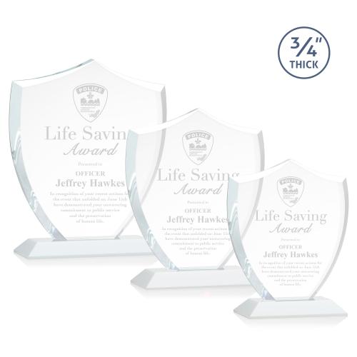 Of the Crystal Awards, this beautiful Scudo Shield Award - White is a great choice. (AWS1812-W) A shield signifies protection, authority, and stability, making the Scudo Shield Award suitable for recognizing outstanding excellence for first responders and law enforcement. This Starfire Crystal Award features beveled edges and is mounted on a mitered optical crystal base.