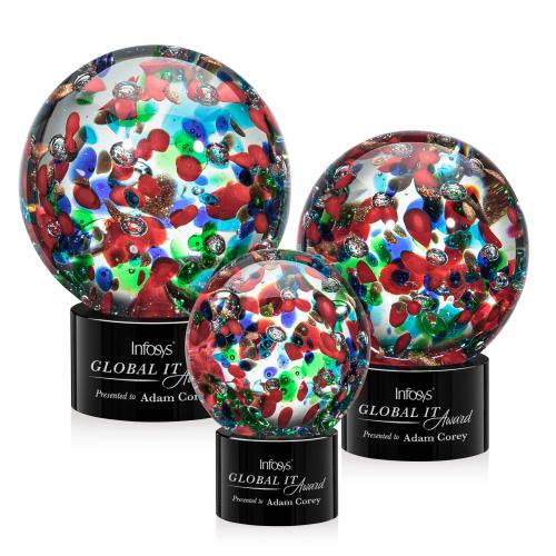 Of the Crystal Awards, this beautiful Fantasia Award on Marvel Base - Black is a great choice. (ARG2021-MK) The Fantasia Award is a spectacular hand-blown work of art. A perfect sphere of abstract vibrant colors to dazzle the eye. Mounted on our Optical Marvel Base. Each piece is individually handcrafted and no two pieces are identical. 1 Colorfill Included on Blue, Green, & Black bases.