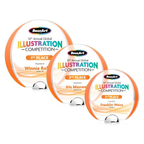 Of the Crystal Awards, this beautiful Stanton VividPrint™ Award - Orange is a great choice. (AWV9301-O) Made of Starfire Crystal, the beautiful round Stanton VividPrint Award features a translucent colored overlay and mirrored accent that creates a halo to surround your words of appreciation. Complete with a polished chrome dome-shaped base, this is the perfect award to recognize special individuals who display continuous excellence.