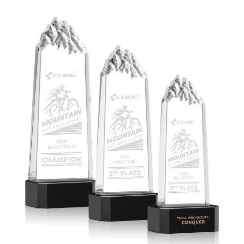 Of the Crystal Awards, this beautiful Himalayas Tower Award on Base - Black is a great choice. (OPT7571-K) The Himalayas Tower Award is for the individual who exceeds limits and accepts every challenge to get to the top! This freestanding thick Optical Crystal Tower features chiseled mountain peaks at the top of the award. Complete with a sapphire, emerald, ebony, or clear thick Optical Crystal base. Second position etch and colorfill optional.