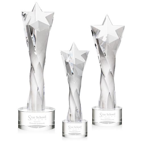 Of the Crystal Awards, this beautiful Arlington Star Award on Marvel Base - Clear is a great choice. (OPS4901-MC) Recognize a rising star with the Arlington Star Award! This twisting tall Optical Crystal tower reveals a star shape cut out at the top and is mounted on a round clear, sapphire, emerald or ebony Optical Crystal base for your words of recognition. Packaged in a satin-lined presentation gift box.