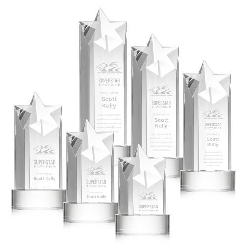 Of the Crystal Awards, this beautiful Berkeley Star on Stanrich Base - Clear is a great choice. (OPS361-SC) The Berkley Star Award on Optical Crystal Base is an inspiring monument to recognize a rising achievement. Reward an exceptional star performance with this pillar of crystal recognition. Bases available in Sapphire, Emerald, Ebony or Clear.