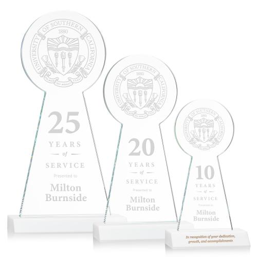 Of the Crystal Awards, this beautiful Laidlaw Tower Award - White is a great choice. (AWS5301-W) The Laidlaw Tower Award features beautiful Starfire Crystal with a large circle at the top that can be used in a myriad of ways. This multi-purpose award is perfect for sports, years of service or to highlight your brand when recognizing excellence. Mounted on a front-mitered Optical Crystal base in your choice of color. Packaged in a black satin-lined presentation gift box. Second location etch and colorfill optional.