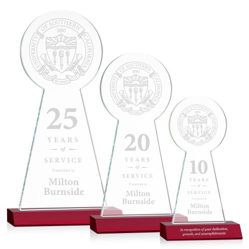 Of the Crystal Awards, this beautiful Laidlaw Tower Award - Red is a great choice. (AWS5301-R) The Laidlaw Tower Award features beautiful Starfire Crystal with a large circle at the top that can be used in a myriad of ways. This multi-purpose award is perfect for sports, years of service or to highlight your brand when recognizing excellence. Mounted on a front-mitered Optical Crystal base in your choice of color. Packaged in a black satin-lined presentation gift box. Second location etch and colorfill optional.
