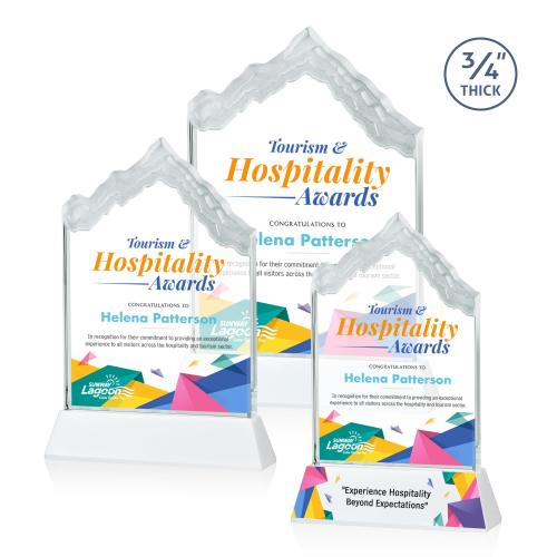 Of the Crystal Awards, this beautiful McKinley VividPrint™ Award on Newhaven - White is a great choice. (AWV86261-W) The highest mountain peak in North America, Mount McKinley is synonymous with the beauty and awe-inspiring natural wonder that is Alaska, the Last Frontier. Featuring 3/4" thick Starfire Crystal, this stunning award is mounted on your choice of clear or colored thick Optical Crystal Newhaven Base. Memorialize your special achievement with a deep etched and frosted monument to one of North America's most stunning peaks. Let your message POP! with full-color VividPrint. Second position imprint on base optional.