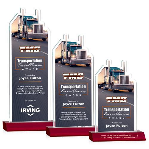 Of the Crystal Awards, this beautiful Longhaul VividPrint™ Award - Red is a great choice. (AWV4161-R) Our extraordinary Starfire Crystal Longhaul VividPrint Award is a meticulously crafted piece of artistry that is a testament to the dedication and achievements within the transportation industry. This award features a finely detailed Transport Truck figure elegantly carved at the top and is mounted on a clear or colored Starfire Crystal front-mitered base. Its unique design embodies precision and elegance, making it a distinguished award for logistics professionals, trucking companies, or special occasions celebrating transportation excellence. Includes imprinted image of the transport truck. Second position imprint on base optional.