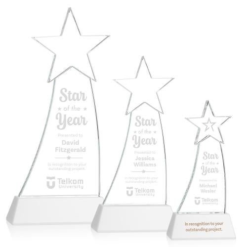 Of the Crystal Awards, this beautiful Manolita Star Award - White is a great choice. (OPS6301-W) Crafted from premium Optical Crystal, the Manolita Star Award boasts a flawless clarity that refracts light with captivating brilliance. Its gracefully curved shape adds a modern touch, while the star at the pinnacle crowns the achievement with celestial significance. Mounted on your choice of clear or colored Optical Crystal Base. Packaged in a black satin-lined presentation gift box. Second and third position etch optional.