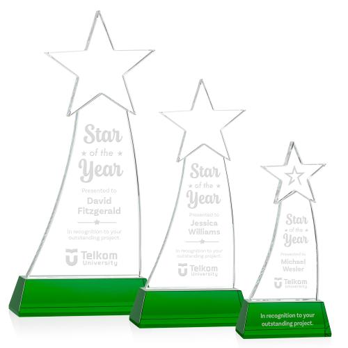 Of the Crystal Awards, this beautiful Manolita Star Award - Green is a great choice. (OPS6301-G) Crafted from premium Optical Crystal, the Manolita Star Award boasts a flawless clarity that refracts light with captivating brilliance. Its gracefully curved shape adds a modern touch, while the star at the pinnacle crowns the achievement with celestial significance. Mounted on your choice of clear or colored Optical Crystal Base. Packaged in a black satin-lined presentation gift box. Second and third position etch optional.