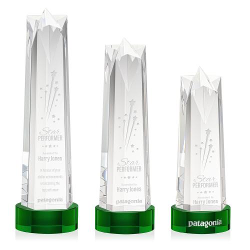 Of the Crystal Awards, this beautiful Ellesmere Star on Stanrich Base - Green is a great choice. (OPS371-SG) The Ellesmere Star Obelisk on Base is a stunning piece of recognition artistry crafted from Optical Crystal. Crowning this exquisite award is a flat star face, meticulously cut and polished to perfection. Its flat surface serves as a canvas for personalized engraving, allowing for a bespoke touch that commemorates the recipient's remarkable success. Complete with a Clear, Emerald, Ebony, or Sapphire Optical Crystal Base. 2nd Position Etch Optional.