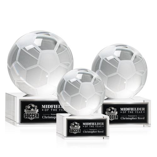 Of the Crystal Awards, this beautiful Soccer Ball Award on Hancock Base is a great choice. (OPT8512-HC) The Soccer Ball Award is a stunning representation of the passion and skill inherent in the beautiful game of soccer. At the heart of this masterpiece is a flawlessly rendered Optical Crystal Soccer Ball that captures and refracts light in a captivating display, evoking a sense of accomplishment and excellence. Mounted on a complimenting Optical base for personalization with a Logo or Name. An exceptional award, gift, or keepsake for soccer enthusiasts, tournaments, or special occasions.