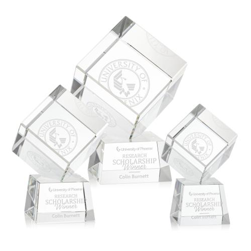 Of the Crystal Awards, this beautiful Burrill Award on Robson Base - Clear is a great choice. (OPT6373-RC) A perfectly polished cube made from the purest Optical Crystal. Features a subtle single beveled edge all around. Let this recognition piece shine as an award, paperweight or momento for your desk or shelf. Complete with your choice of Clear, Ebony, Sapphire, or Emerald tapered Optical Crystal base.