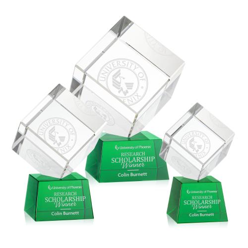 Of the Crystal Awards, this beautiful Burrill Award on Robson Base - Green is a great choice. (OPT6373-RG) A perfectly polished cube made from the purest Optical Crystal. Features a subtle single beveled edge all around. Let this recognition piece shine as an award, paperweight or momento for your desk or shelf. Complete with your choice of Clear, Ebony, Sapphire, or Emerald tapered Optical Crystal base.