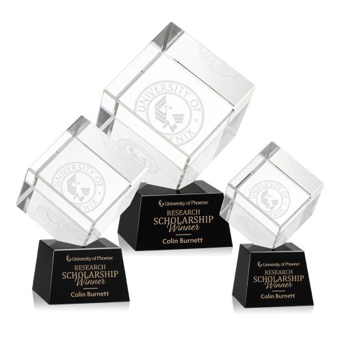 Of the Crystal Awards, this beautiful Burrill Award on Robson Base - Black is a great choice. (OPT6373-RK) A perfectly polished cube made from the purest Optical Crystal. Features a subtle single beveled edge all around. Let this recognition piece shine as an award, paperweight or momento for your desk or shelf. Complete with your choice of Clear, Ebony, Sapphire, or Emerald tapered Optical Crystal base.